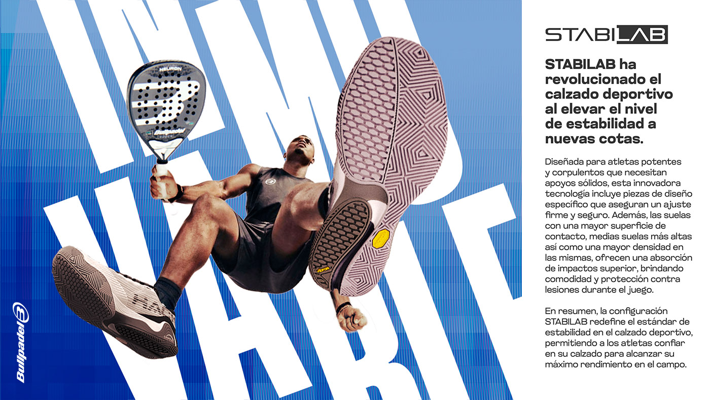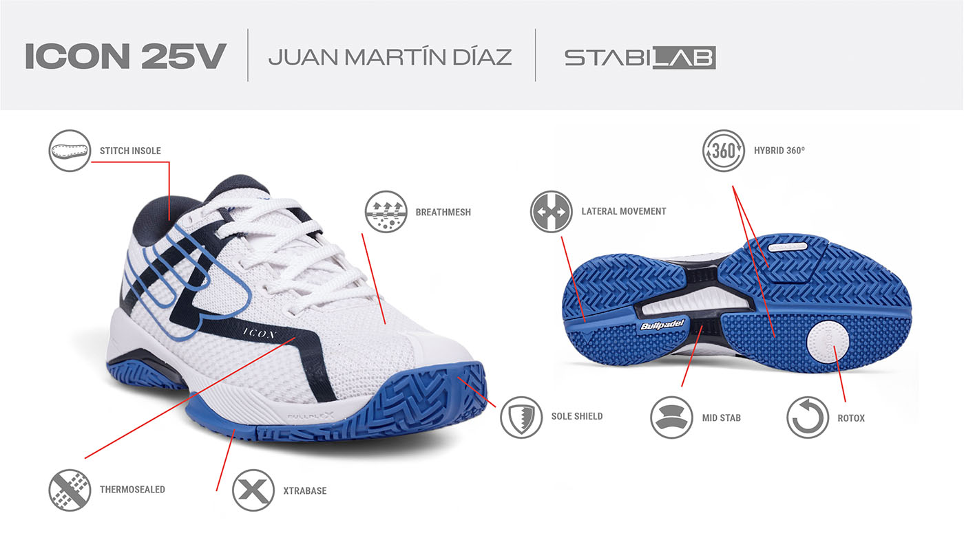 Zapatilla de Martín Di Nenno. Cuenta con una nueva suela desarrollada en colaboración con VIBRAM. Insiste en la idea del patín híbrido, pero, en este caso, se ha concebido para proporcionar un extra de ligereza para aquellos jugadores que buscan una mayor velocidad en sus desplazamientos. Destacamos la doble altura de la zona de espiga, que redunda en el equilibrio entre desplazamiento y tracción.