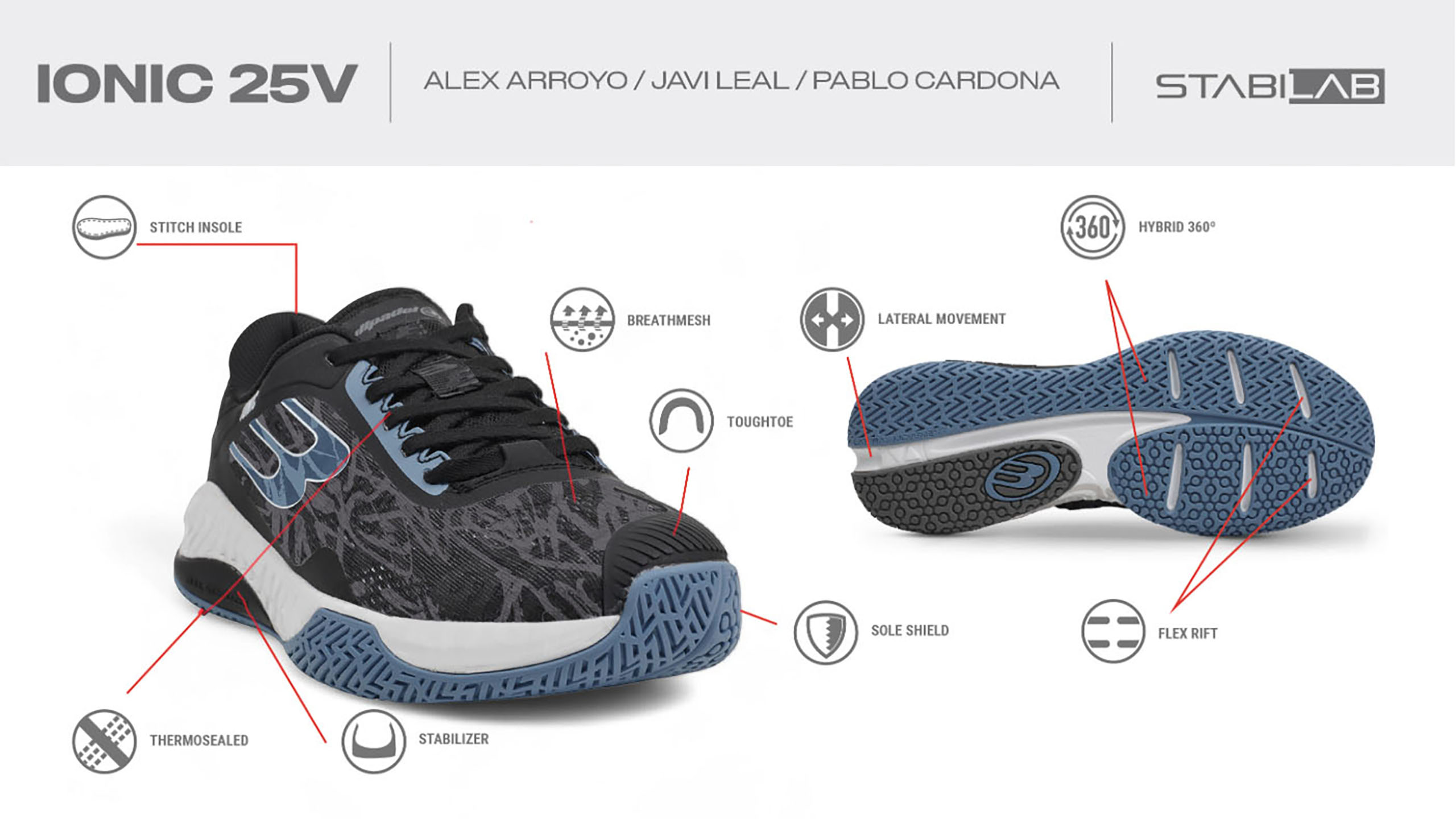 Modelo destinado a las jóvenes promesas como Pablo Cardona, Alex Arroyo y Javier Leal. Destaca por su diseño atrevido sobre un mesh Jacquard para una mayor transpiración. Su suela nos permitirá evolucionar en nuestro juego gracias a la combinación idónea entre movilidad y agarre, además de aportarnos la amortiguación requerida en nuestra evolución.