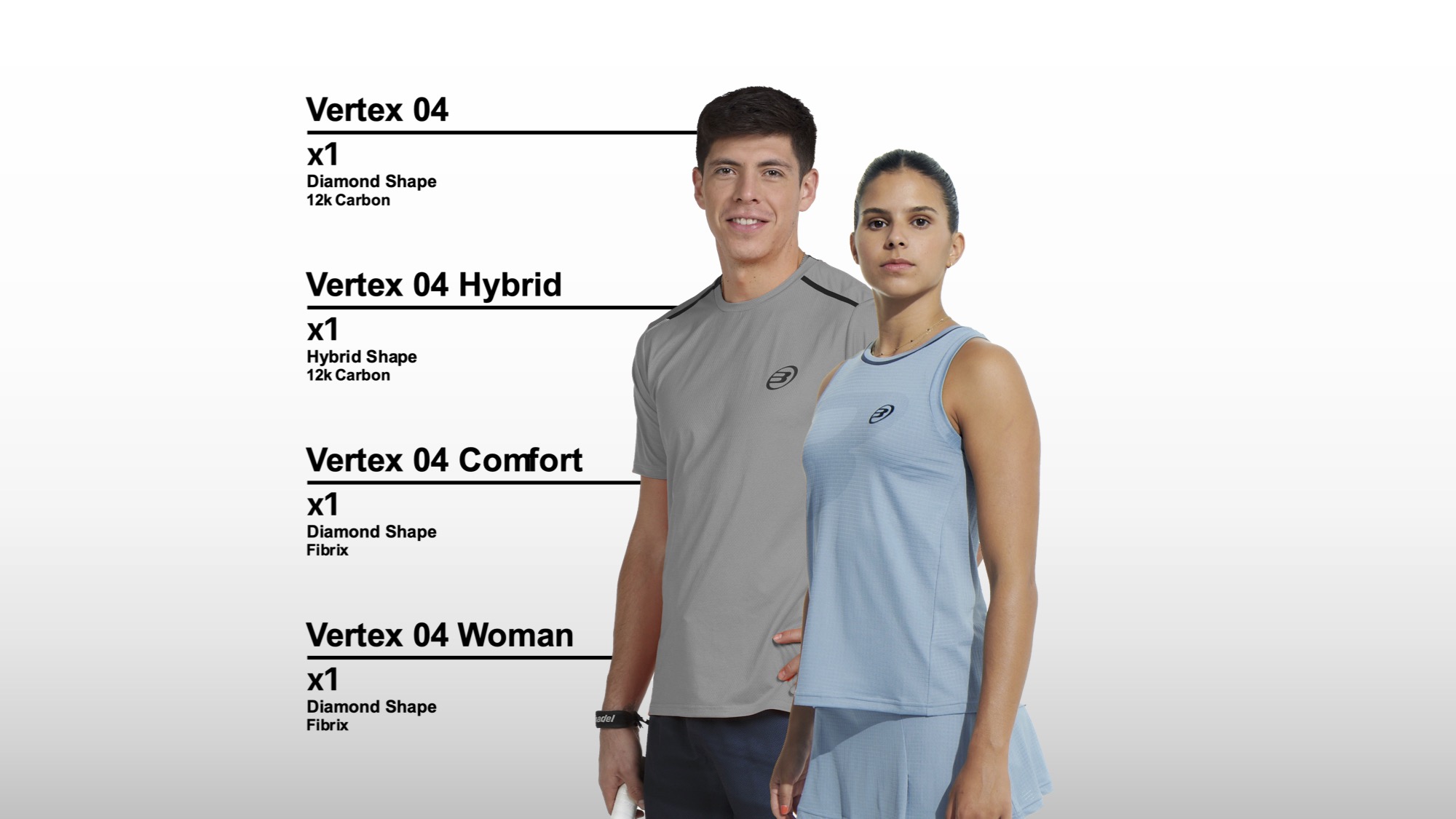 La Vertex 04 Comfort es una pala con formade diamante, de máxima potencia, de alto rendimiento sin pérdidas de control, y con una superficie rugosa Top Soin. Está concebida para jugadores profesionales o avanzados.