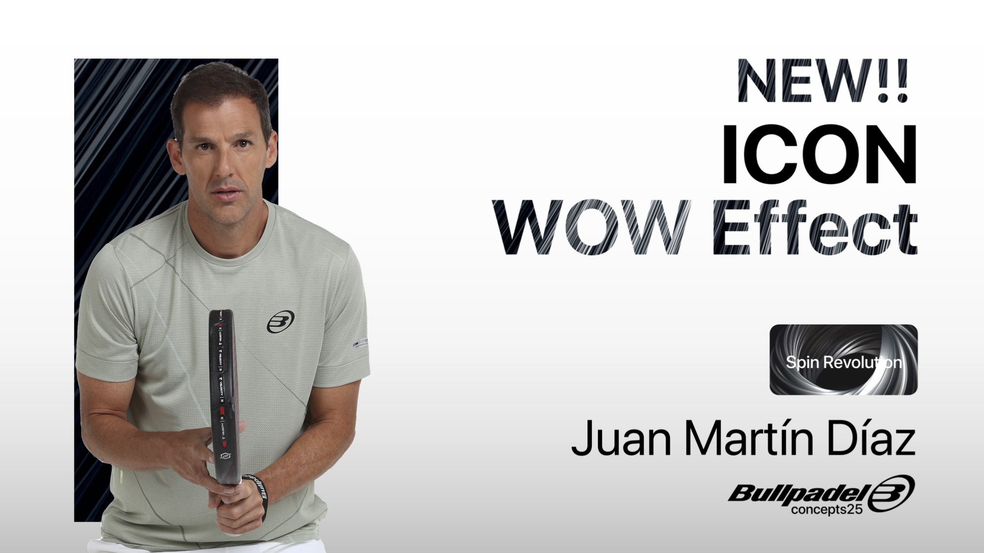 ICON la nueva pala de Juan Martín Díaz. Una pala con un nuevo concepto CURV en los brazos, incorpora la tecnología más radical hasta la fecha por el equipo Bullpadel-Lab como es Gyroflex. ICON, diseñada para honrar el legado y la maestría de Juan Martín Díaz en el mundo del pádel se inspira en su estilo de juego excepcional y su impacto en el deporte, para dejar huella a golpe de efecto.