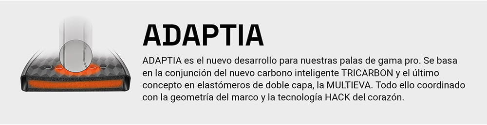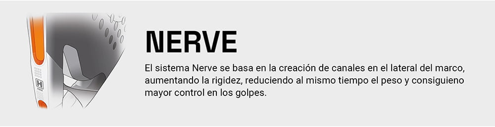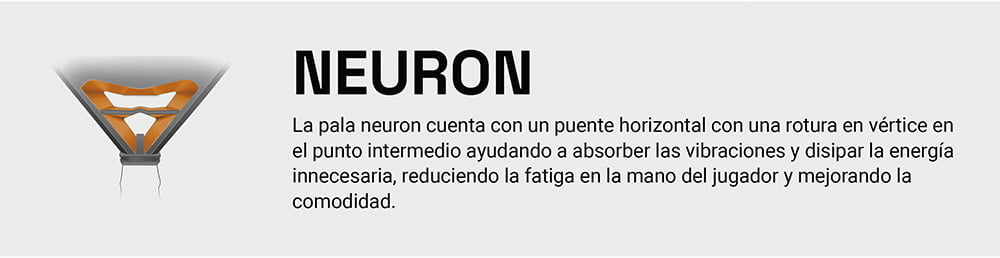 La nueva Neuron es una pala con forma híbrida, con gran facilidad para acelerar la bola. Está concebida para jugadores profesionales o avanzados. Incorpora dos conceptos nuevos en el marco, el corazón Neuron, con un puente transversal que confiere estabilidad para evitar las torsiones. Por otro lado, el perfil lateral Wave, que consiste en un marco con estructura en forma de ondas que disipa las vibraciones y reduce la flexión de la pala a la hora del golpe. Fácil aceleración con menor esfuerzo. El núcleo externo se compone de carbono Xtend Carbon 3K, su núcleo interno de la nueva goma MultiEva y el marco CarbonTube de fibra de carbono 100%. Dispone del sistema Vibradrive para absorción de vibraciones. Además, incorpora el grip Hesacore, el cual reduce el esfuerzo, las vibraciones y la probabilidad de lesiones.