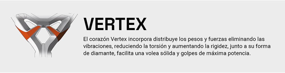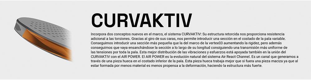 La pala Vertex 04W es una pala ligera con forma de diamante, de máxima potencia, alto rendimiento sin pérdidas de control y con superficie rugosa Topspin para un mayor agarre y efecto de la bola. Está concebida para jugadoras profesionales o avanzadas. Incorpora dos conceptos nuevos en el marco, el sistema CURVAKTIV: Su estructura retorcida nos proporciona resistencia adicional a las torsiones. Gracias al giro de sus caras, nos permite introducir una sección en el costado de la pala variable. Conseguimos introducir una sección más pequeña que la del marco de la vertex03 aumentando la rigidez, pero además conseguimos que vaya ensanchándose la sección a lo largo de su longitud consiguiendo una transmisión más uniforme de las tensiones por toda la pala. Esta mejor distribución de las vibraciones y esfuerzos está apoyada también en la unión del CURVAKTIV con el AIR POWER. El AIR POWER es la evolución natural del sistema Air React Channel. Es un canal que generamos a través de una pieza hueca en el costado inferior de la pala. Esta pieza hueca trabaja mejor que si fuera una pieza maciza ya que al estar formada por menos material es menos propensa a la deformación, haciendo la estructura más fuerte