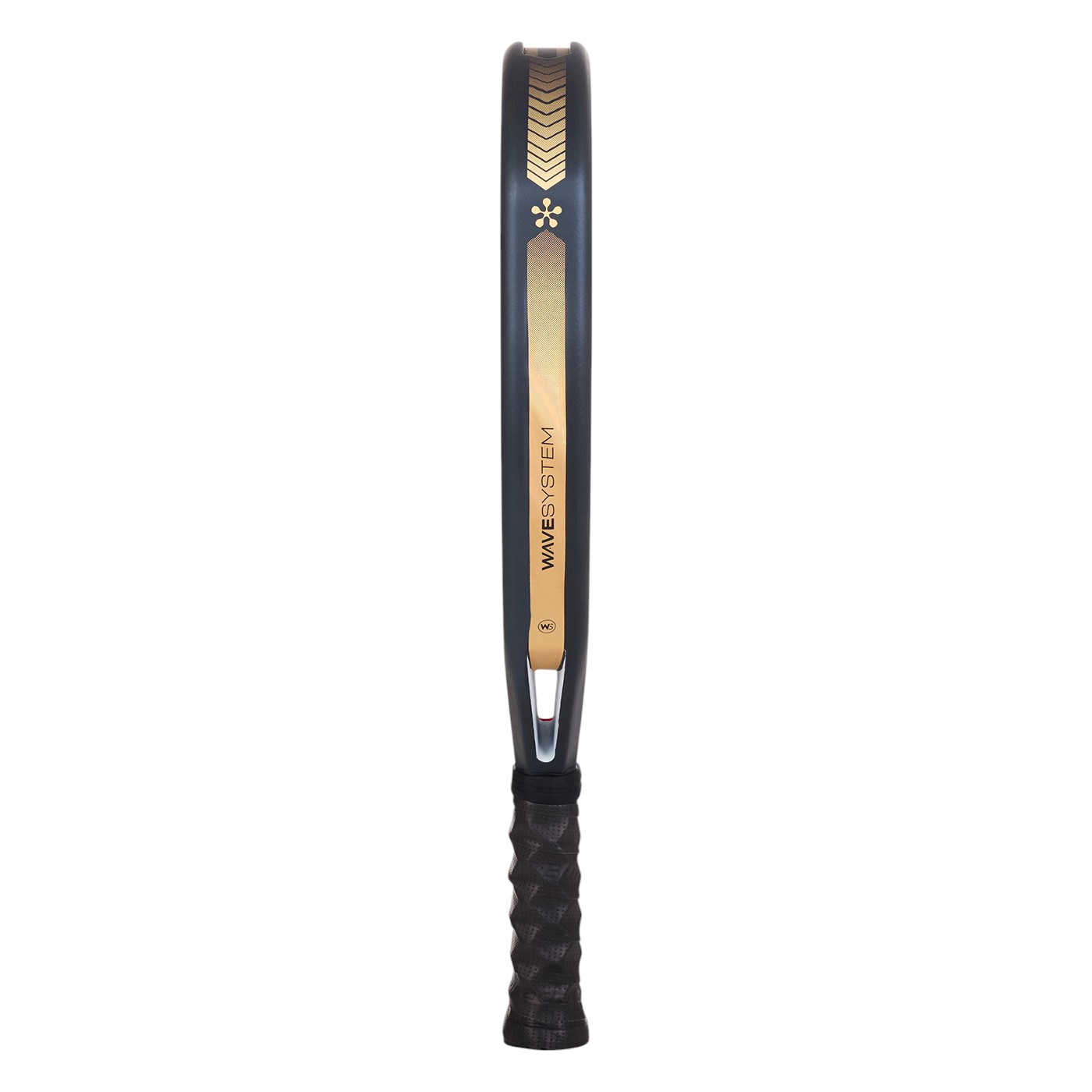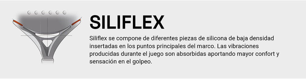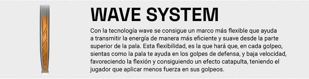WAVE SYSTEM Con la tecnología wave se consigue un marco más flexible que ayuda a transmitir la energía de manera más eficiente y suave desde la parte superior de la pala. Esta flexibilidad, es la que hará que, en cada golpeo, sientas como la pala te ayuda en los golpes de defensa, y baja velocidad, favoreciendo la flexión y consiguiendo un efecto catapulta, teniendo el jugador que aplicar menos fuerza en sus golpeos.