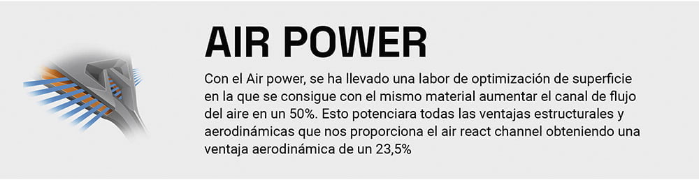 AIR POWER, Con el Air power, se ha llevado una labor de optimización de superficie en la que se consigue con el mismo material aumentar el canal de flujo del aire en un 50%. Esto potenciara todas las ventajas estructurales y aerodinámicas que nos proporciona el air react channel obteniendo una ventaja aerodinámica de un 23,5%