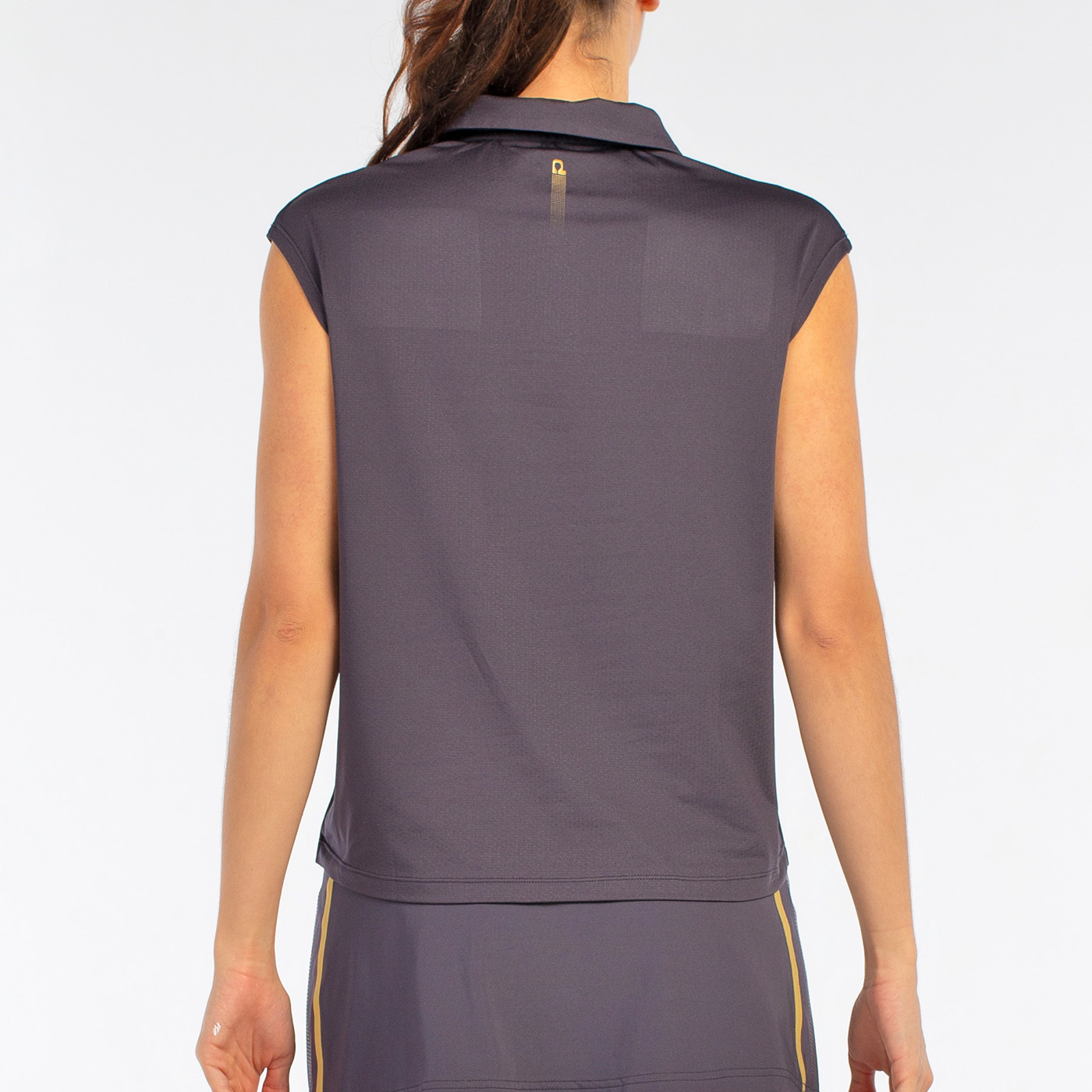 Polo en tejido de punto de poliéster elástico, con inserciones de rejilla en los hombros para mayor ventilación. Se le aplica