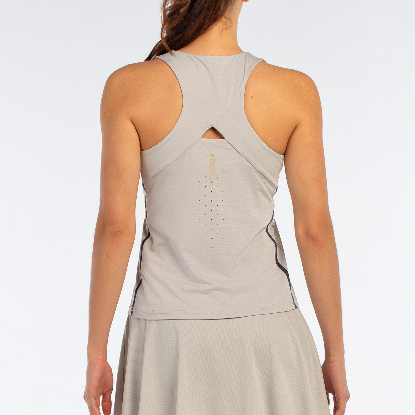 Diseño elegante de tirantes, silueta suelta, costura termosellada rematada con cinta ultrasónica en centro de espalda. Decorada con estampado en el frontal delantero y los gráficos de Premier Padel.