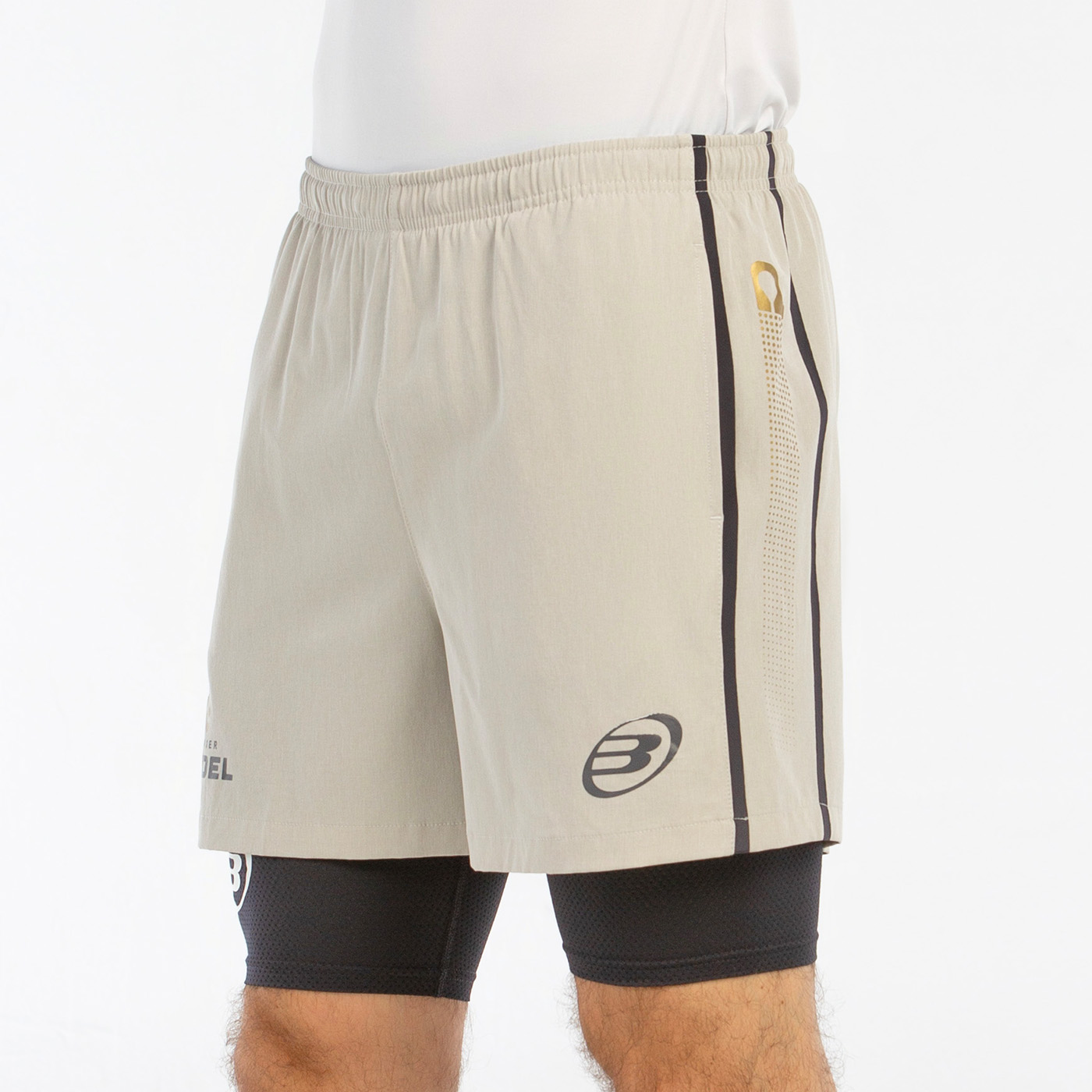 Bermuda en tejido a la plana de poliéster, elástica en dos direcciones. Cuenta con la tecnología Binamic, aplicada a tejidos bielásticos, integrando también el acabado de secado rápido. Diseño compuesto de pantalón con un largo de 42 cm, cinturilla ajustable con cordón, bolsillos y suspensorio interior de rejilla elástica. Decorada con los gráficos de Premier Padel.