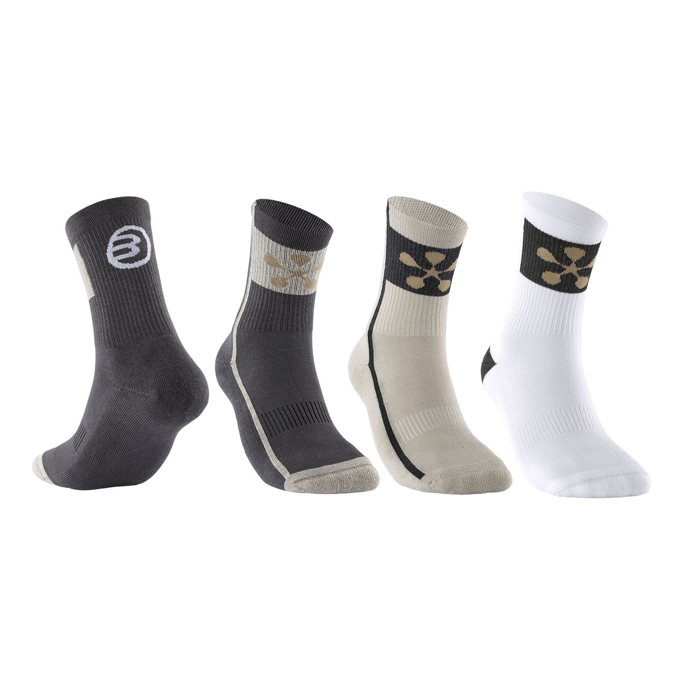 Pack de 3 pares de calcetines, de algodón elástico con poliamida, muy transpirables y cómodos. De caña media y personalizados con los gráficos de Premier Padel.