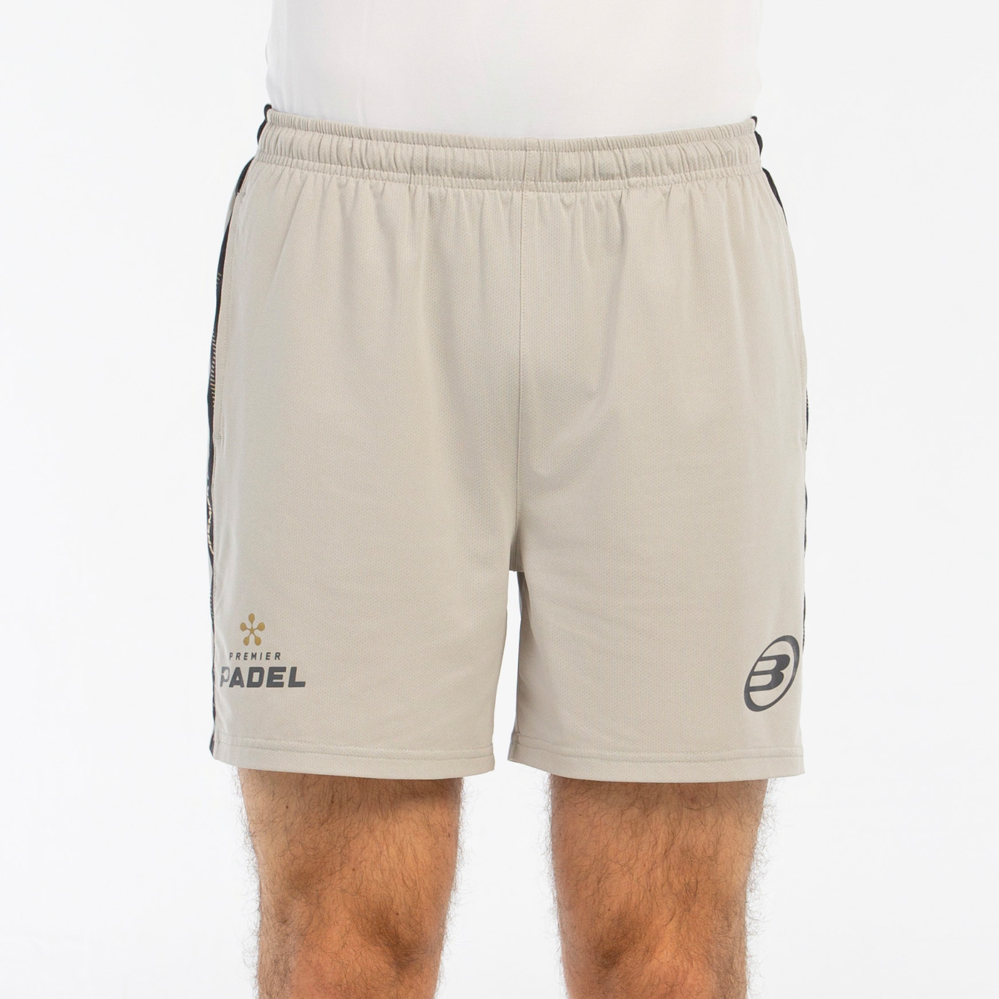 Bermuda en tejido a la plana de poliéster, elástica en dos direcciones. Cuenta con la tecnología Binamic, aplicada a tejidos bielásticos, integrando también el acabado de secado rápido. Diseño compuesto de pantalón con un largo de 42 cm, cinturilla ajustable con cordón, bolsillos, estampado en los laterales y suspensorio interior de rejilla elástica. Decorada con los gráficos de Premier Padel.