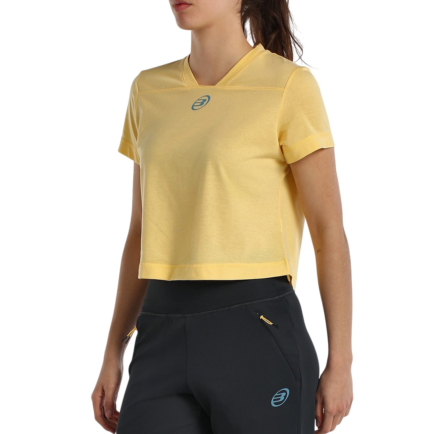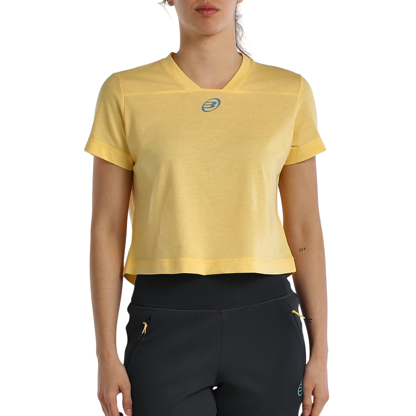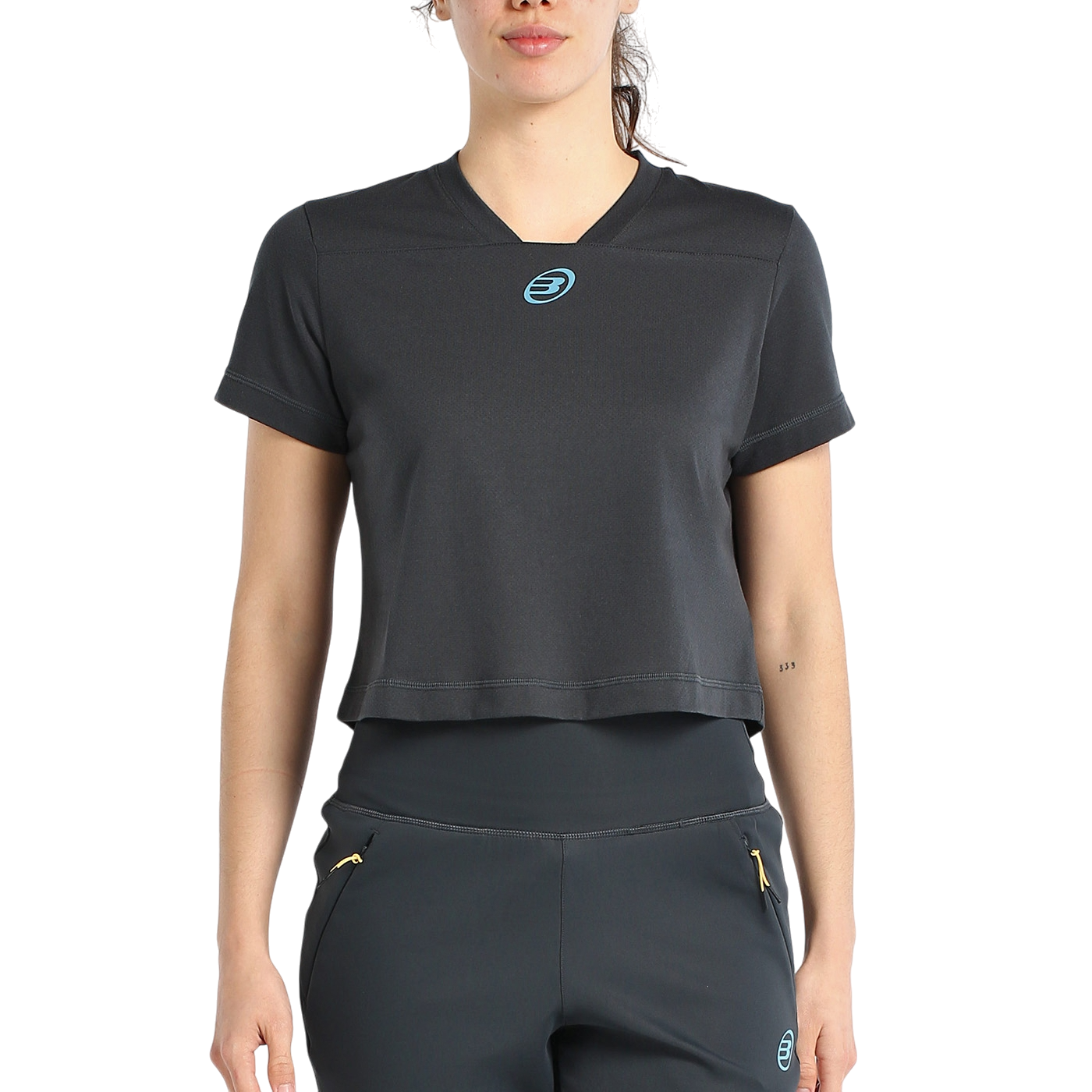 Camiseta de manga corta y cuello de pico. Corte en el pecho donde termina el cuello. Logotipo de Bullpadel en el pecho y de Bea en la espalda.
