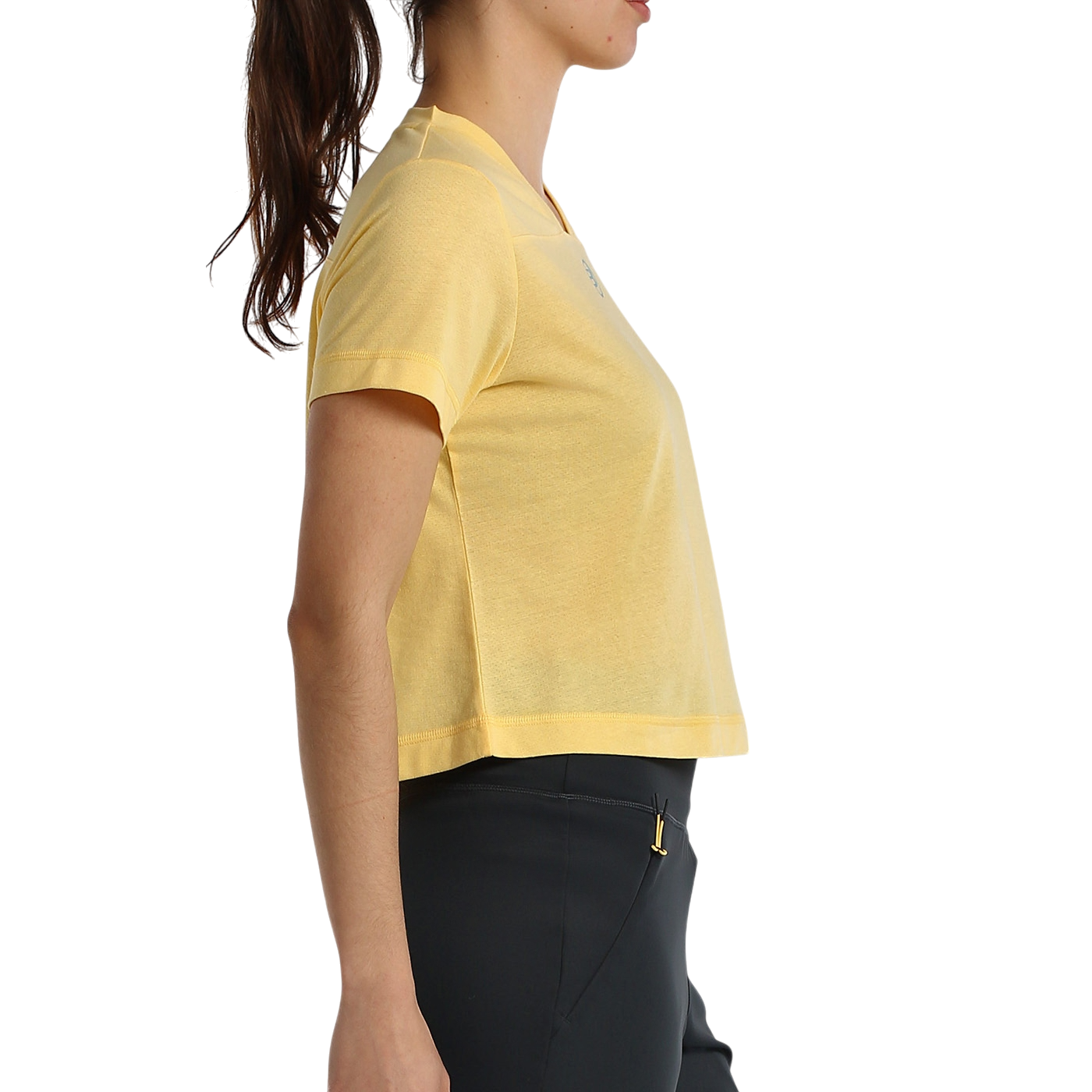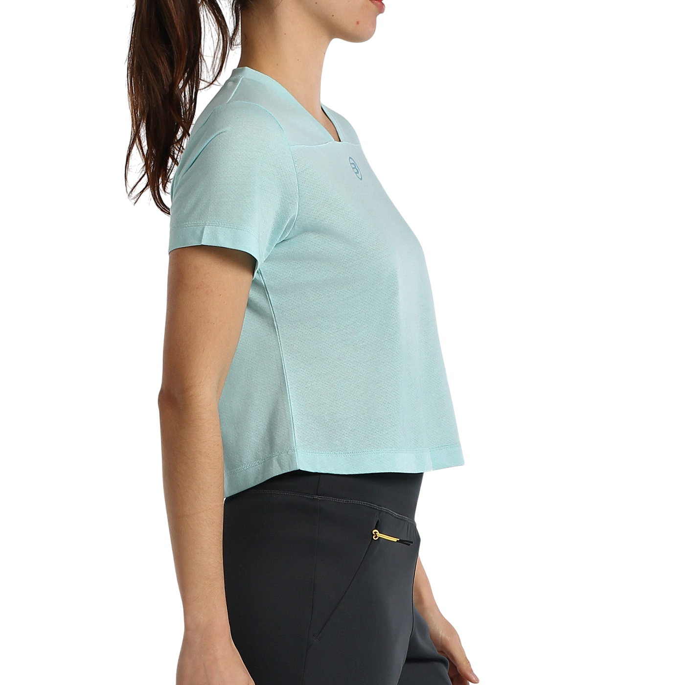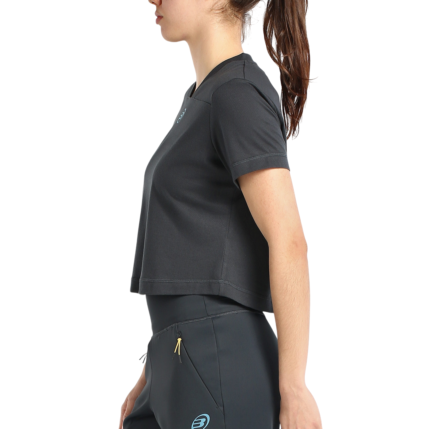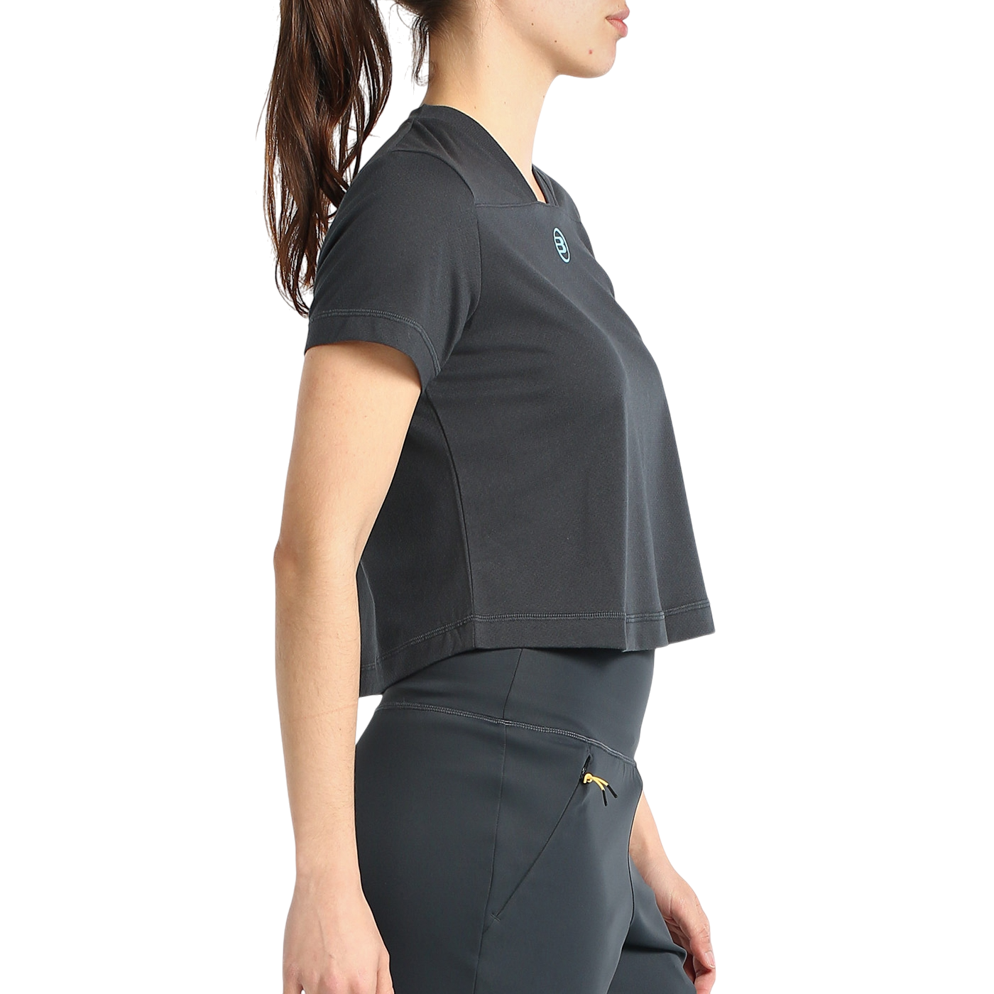 Camiseta de manga corta y cuello de pico. Corte en el pecho donde termina el cuello. Logotipo de Bullpadel en el pecho y de Bea en la espalda.