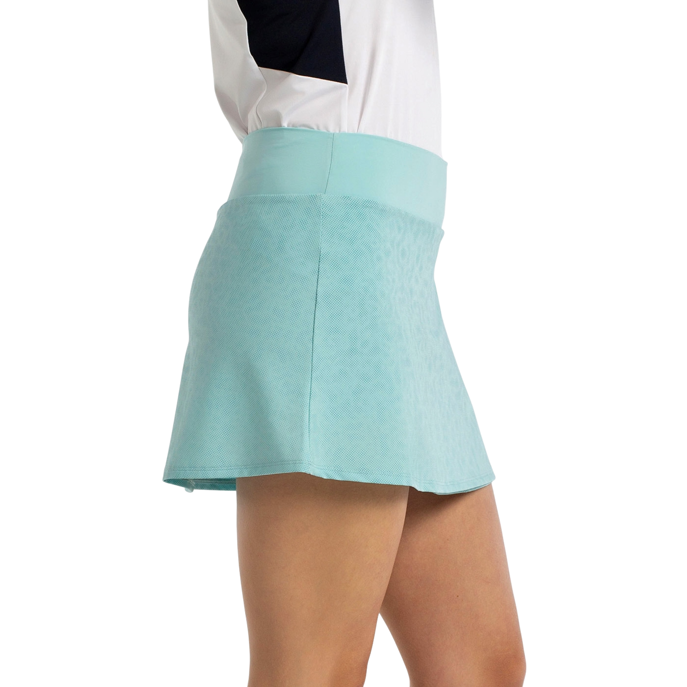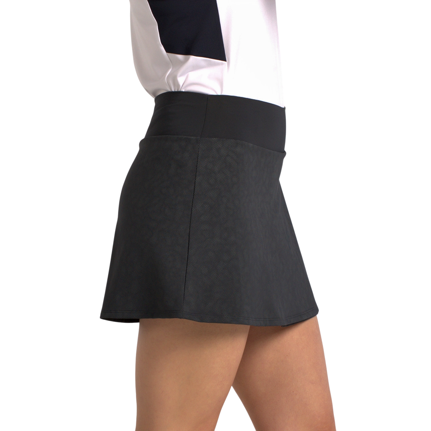 Falda en nylon estampada. Cuenta con malla interior a contraste y cinturilla alta que moldea la silueta. Fabricado con tejido de single jersey de nylon elástico. Al tejido bielástico se le aplica la tecnología Drylum. Es hidrófobo, transpirable, retiene poco líquido y seca con rapidez. Tejido ultraligero de microfilamentos de poliamida con elastán, que proporciona gran libertad de movimiento.