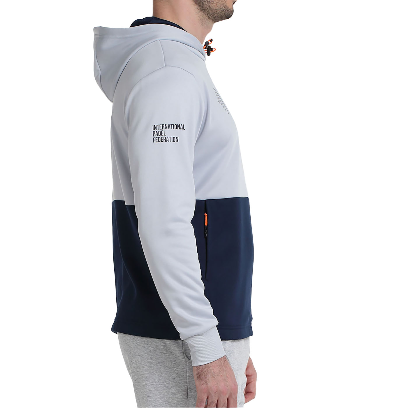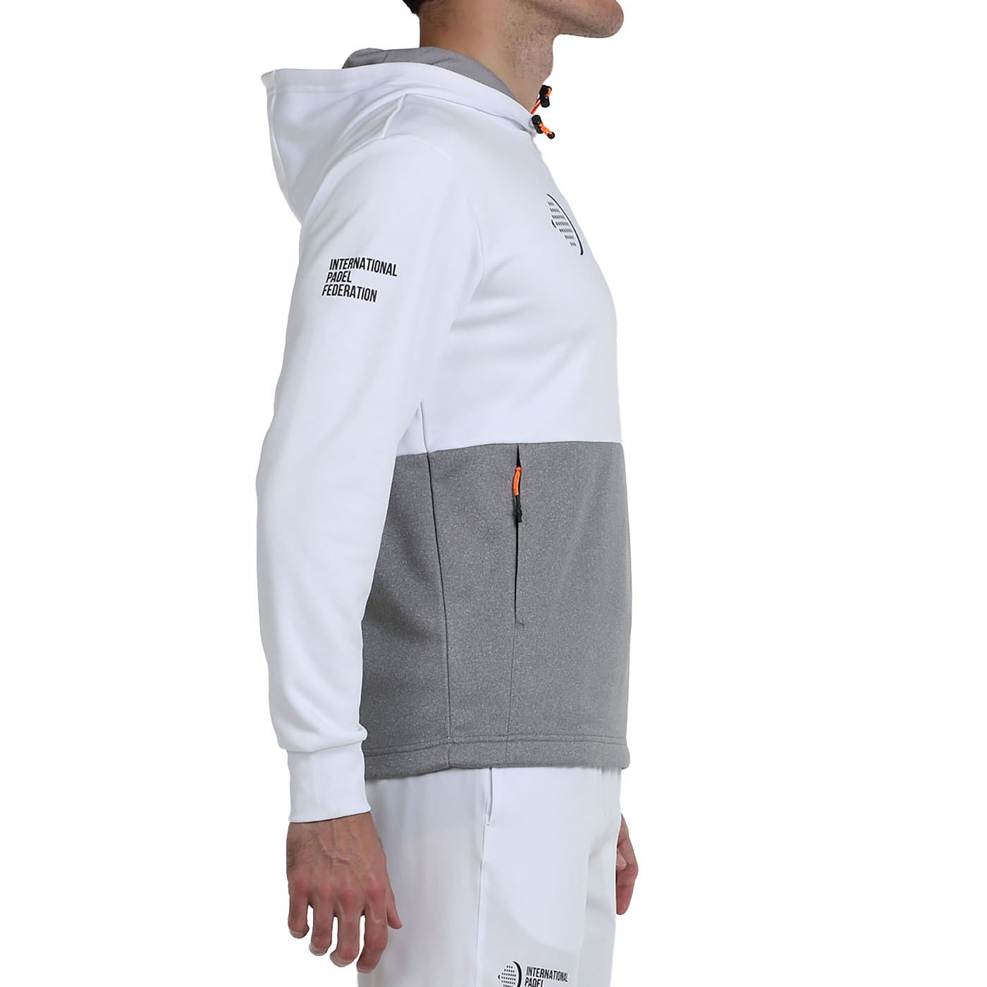 Sudadera con capucha de nuestra línea especial de la Federación Internacional de Pádel. La prenda es cálida, fabricada en Interlock de poliéster elástico con interior perchado, e incorpora bolsillos laterales con cremallera y puños de rib. Su diseño presenta una pieza a contraste en la parte inferior y detalles con prints de la línea.