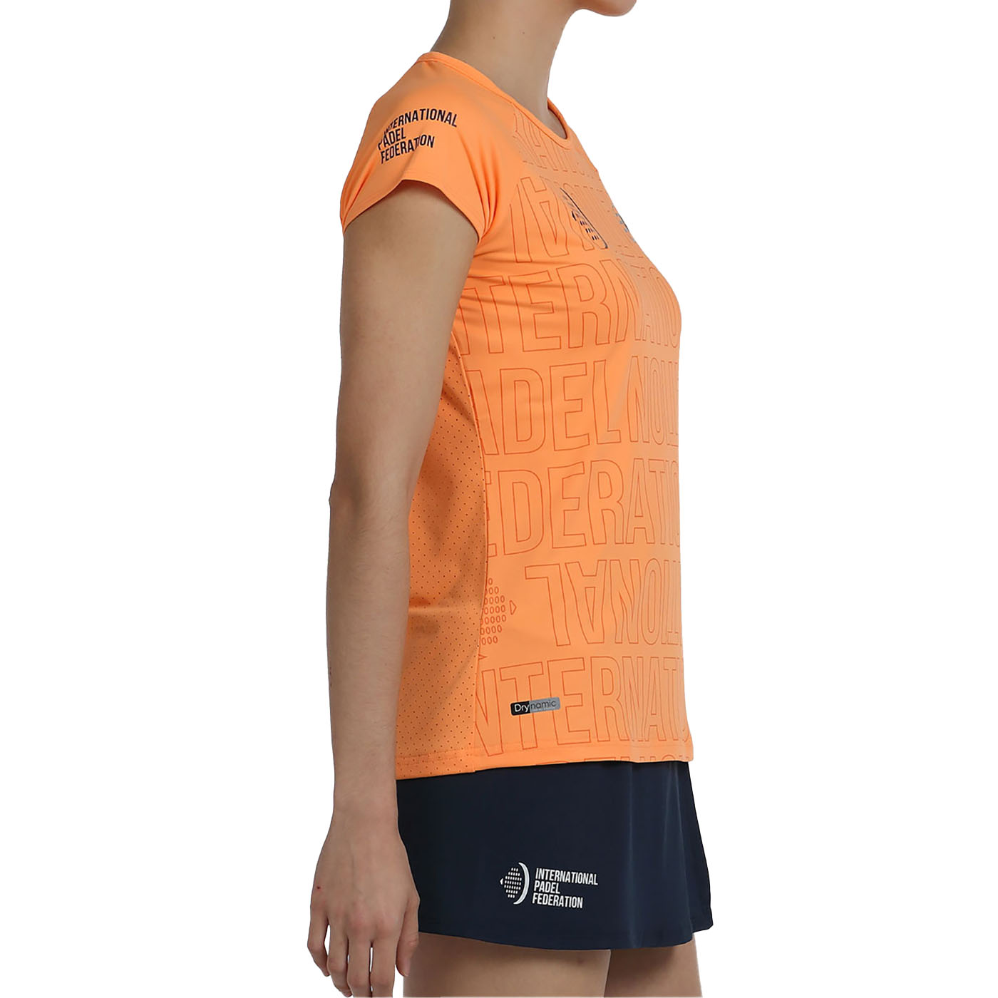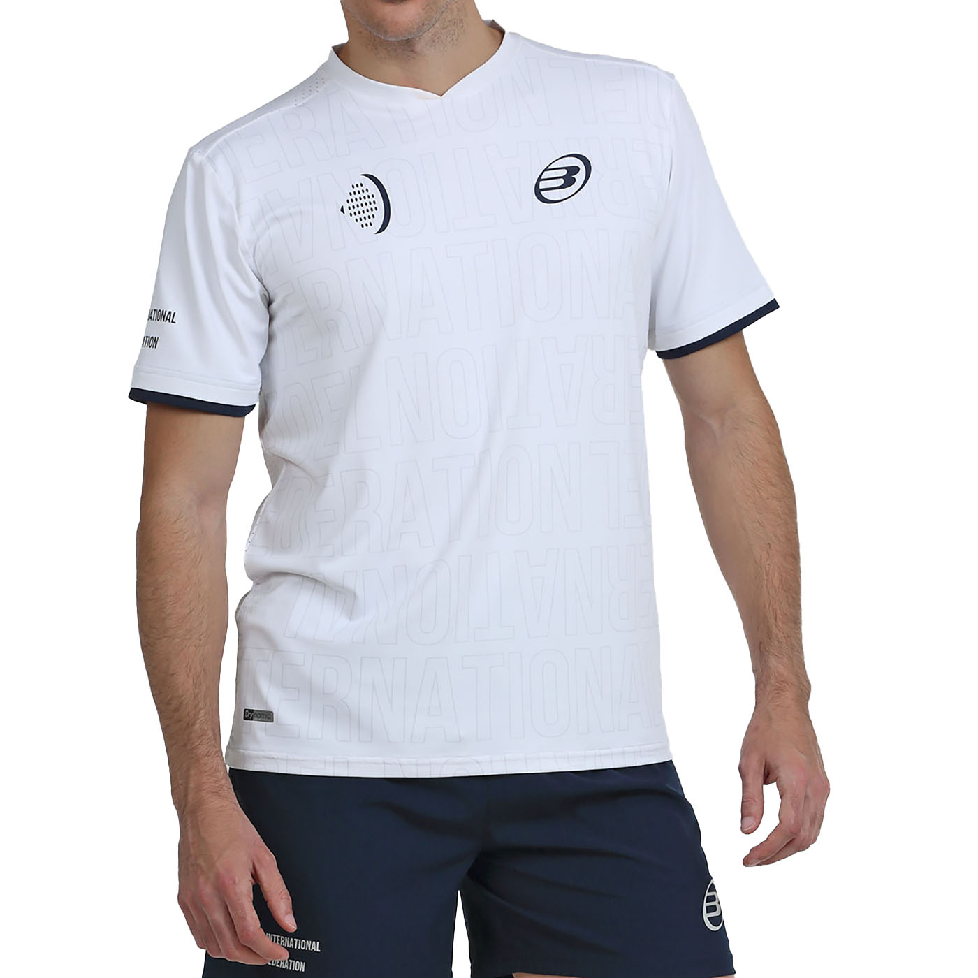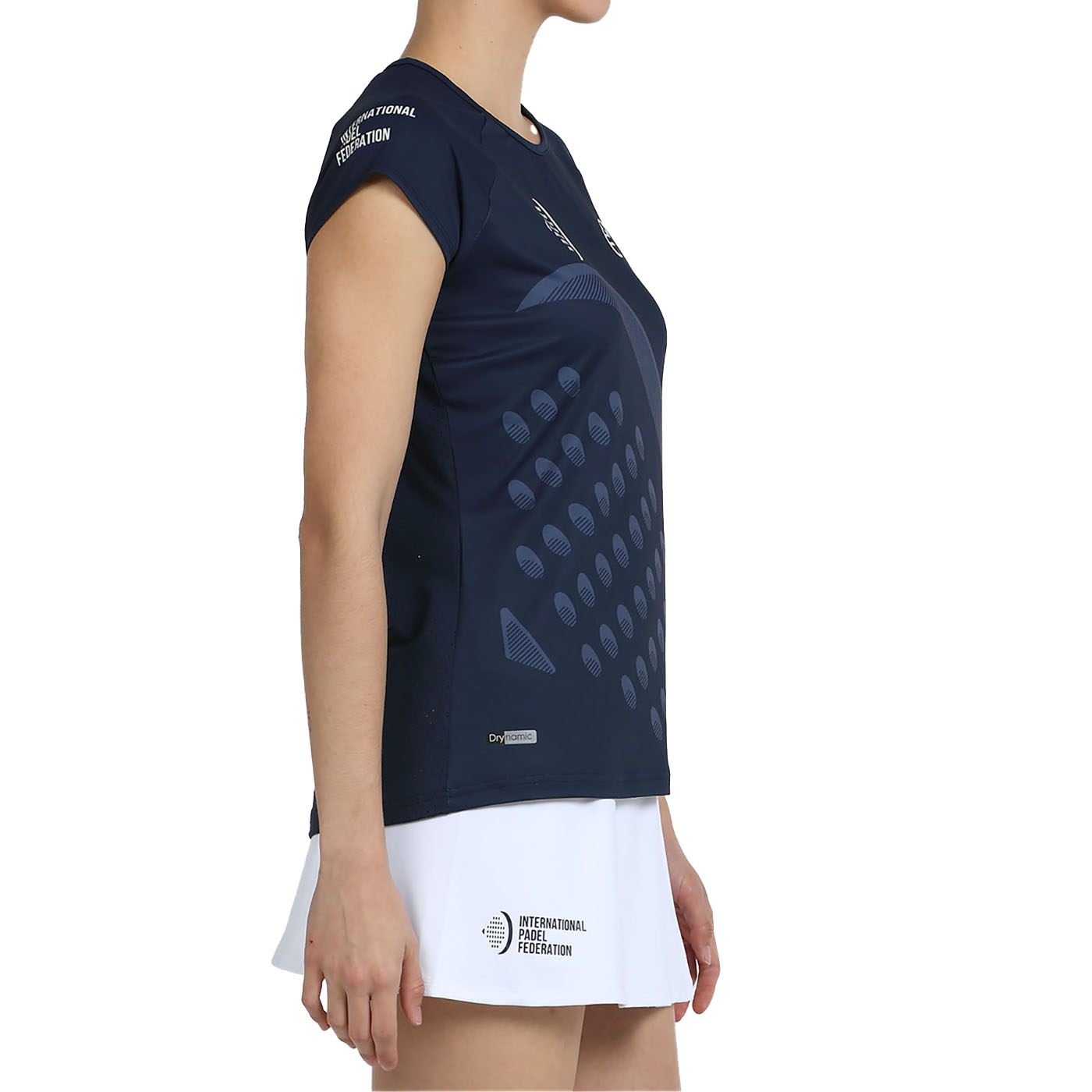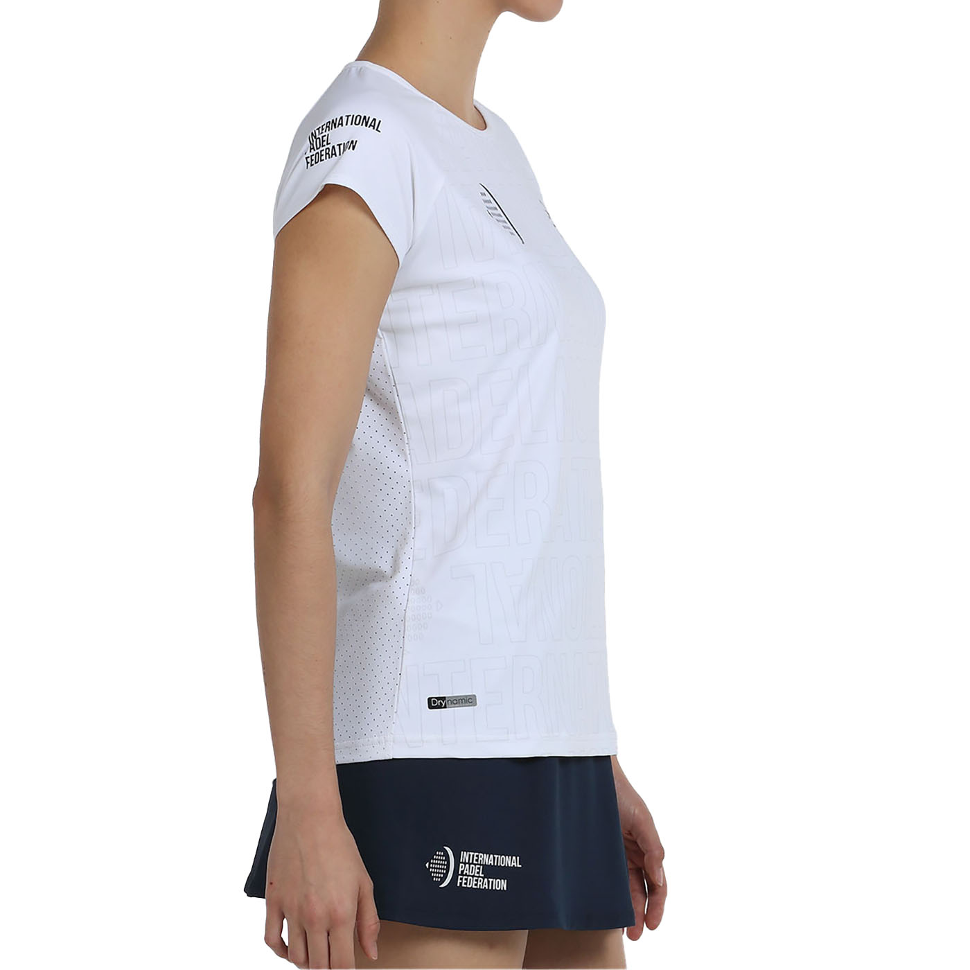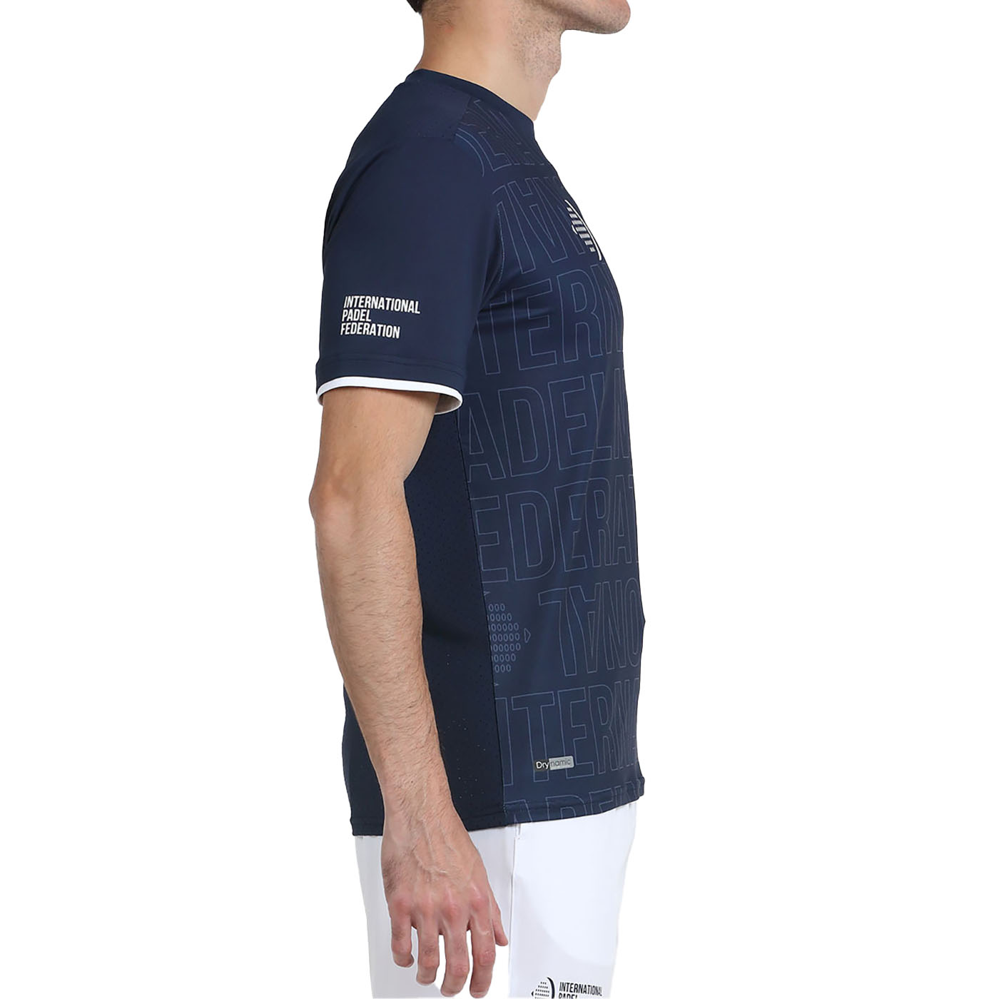 Camiseta de nuestra línea especial de la Federación Internacional de Pádel. Presenta un diseño elegante por sublimación en la zona delantera, la espalda decorada con efecto texturizado a través de presión y detalles con prints de la colección. Está fabricada con tejido técnico y ligero de poliéster y Spandex elástico, dotando a la prenda de confort y funcionalidad. Además, incorpora la tecnología Drynamic, que utiliza micro-filamentos para reducir la humedad y favorecer la transpiración.