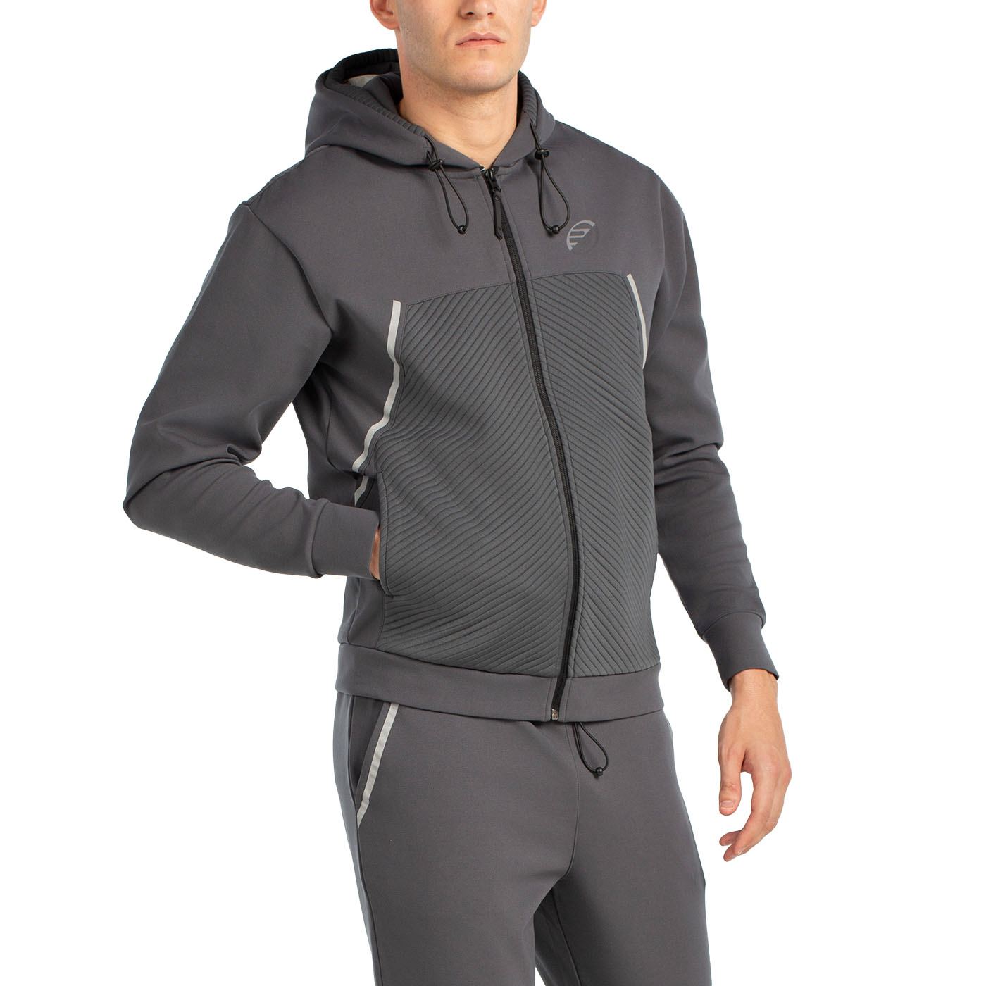 Sudadera de capucha y bolsillo de canguro con cremalleras en tejido de interlock perchado de poliéster con elastán. Tiene una decoración en el delantero en high density siliconado.